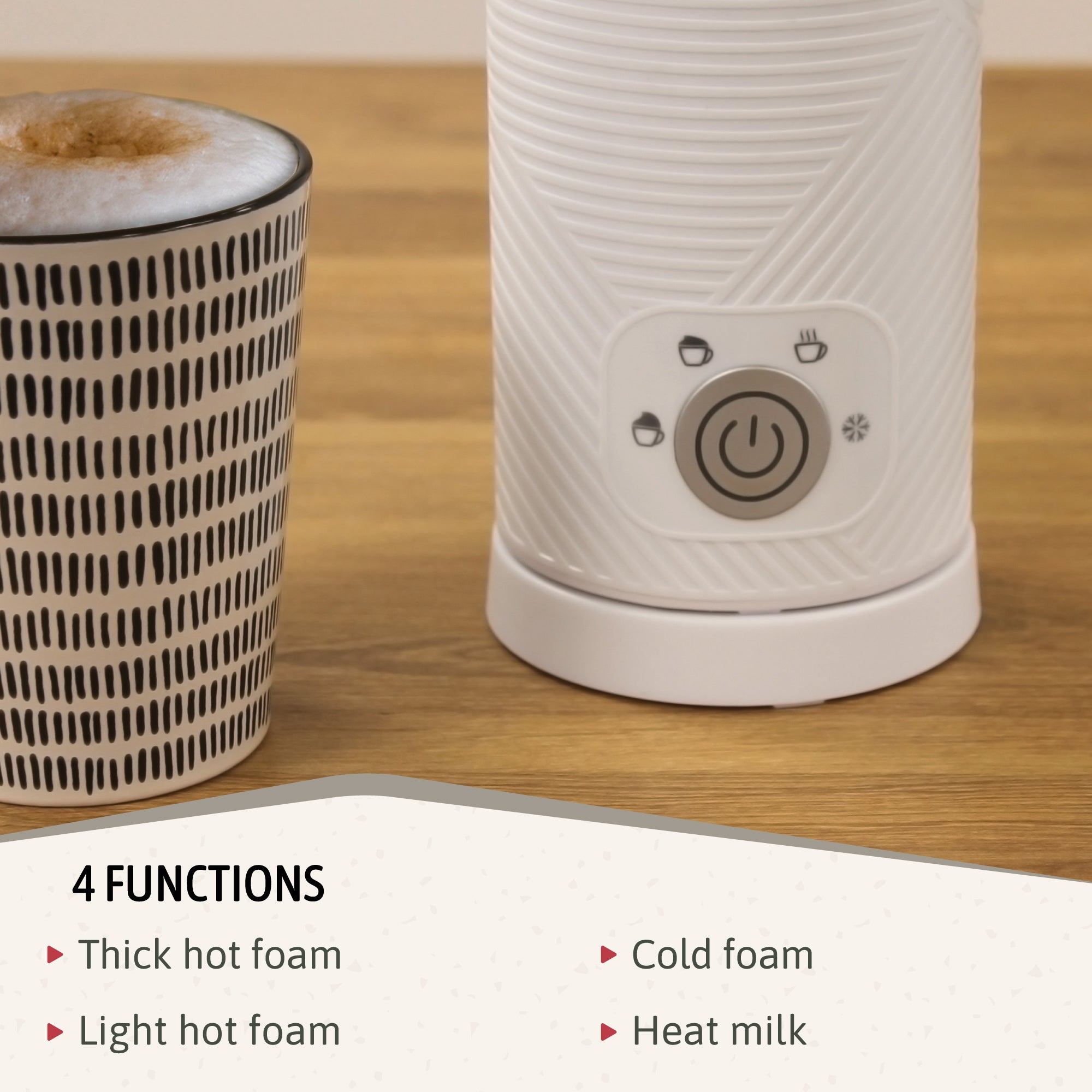 Una vez encendido y con la cantidad de leche que corresponda, sólo tienes que presionar 1 vez el botón de encendido para obtener espuma caliente espesa, 2 veces para espuma caliente ligera, 3 veces para calentar leche a 65℃ y 4 veces para espuma fría. 500W para crear espuma rica y densa en minutos.