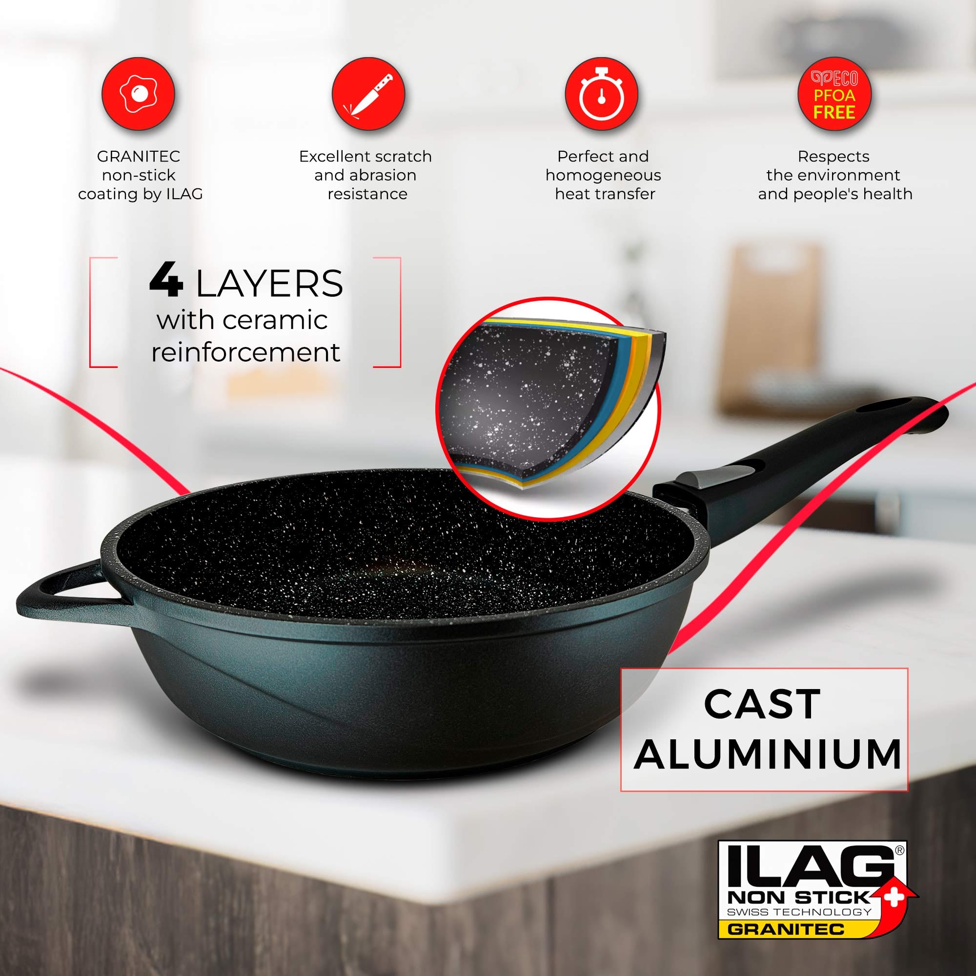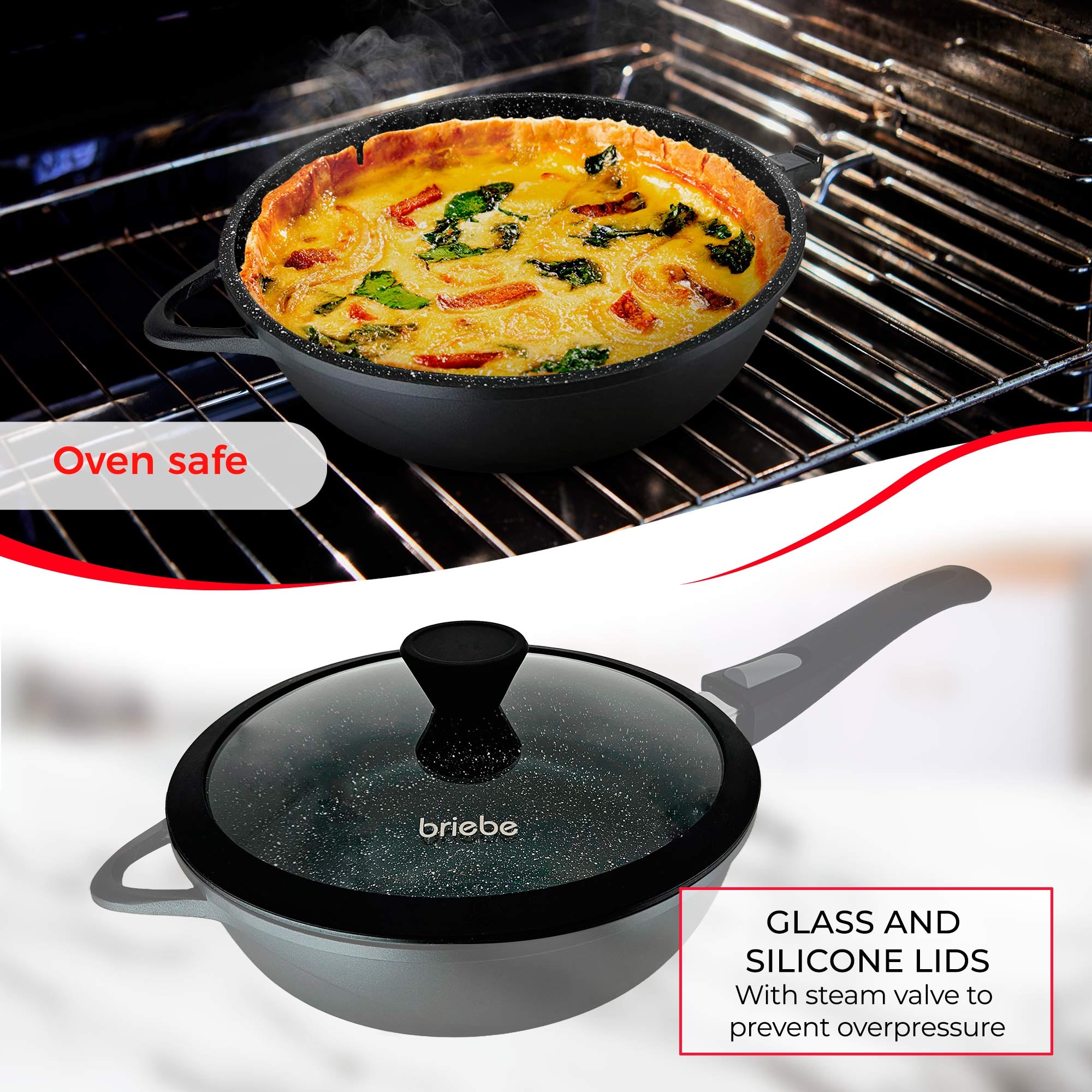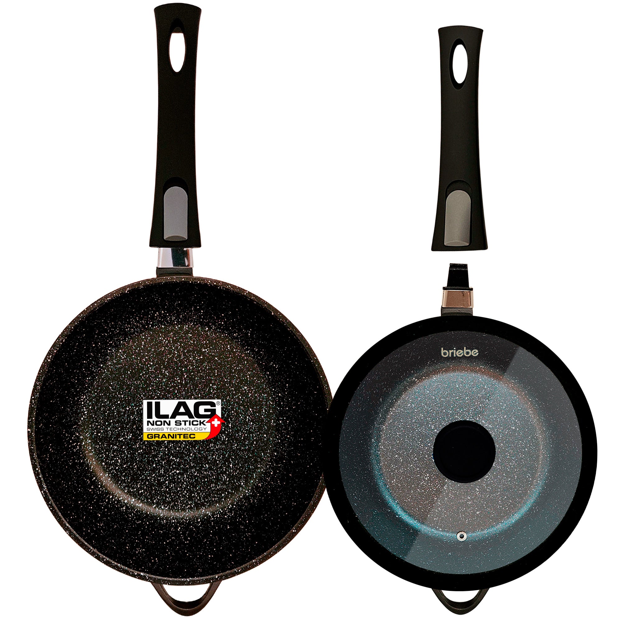 Este juego de sartenes briebe está fabricado con antiadherente GRANITEC de ILAG, marca Suiza especialista en recubrimientos antiadherentes de alta calidad. Consta de 4 capas con refuerzo cerámico que ofrece una excelente resistencia a rayaduras y abrasiones. Ideal para uso diario e intensivo.