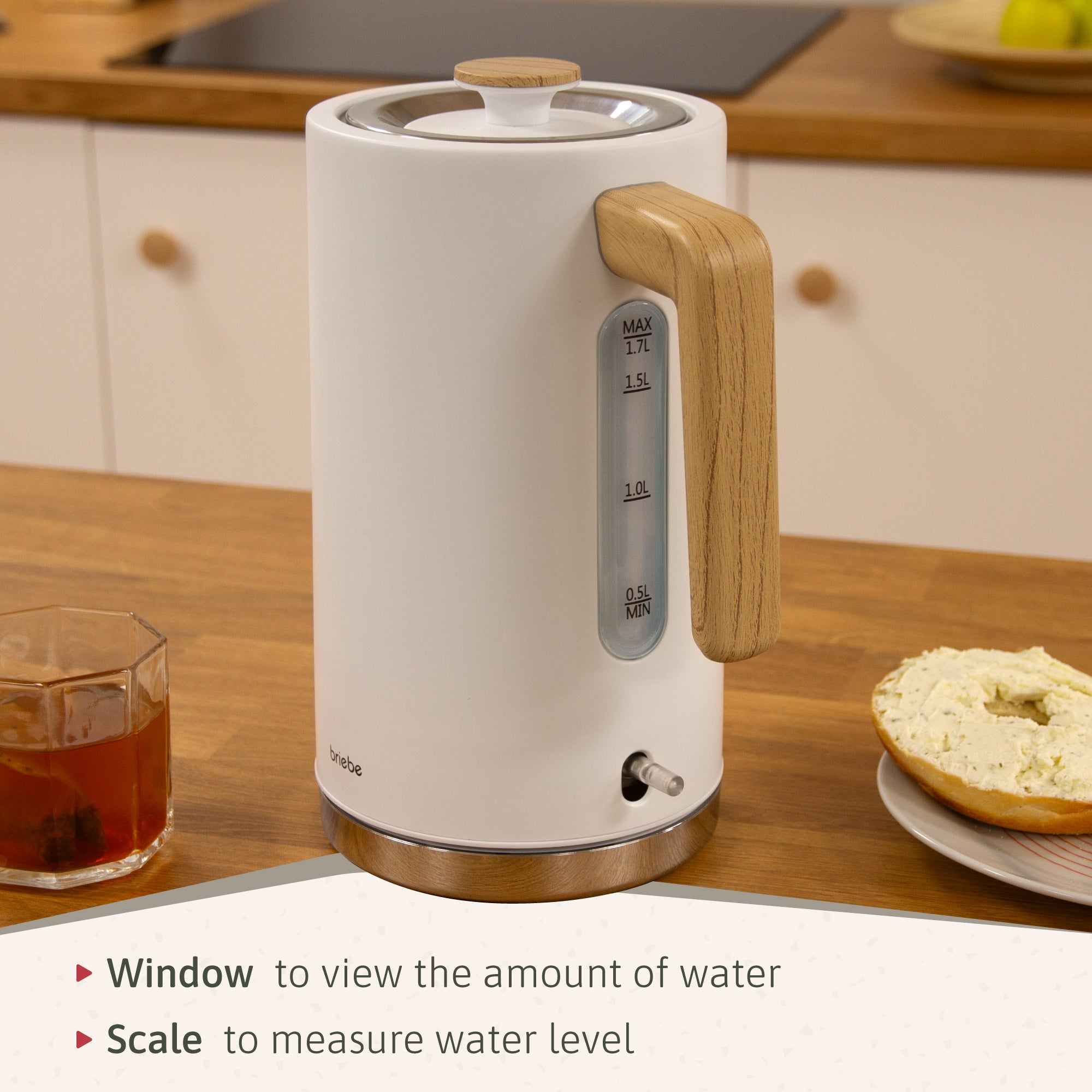 El hervidor eléctrico dispone de una ventana con escala para que puedas ver en todo momento la cantidad de agua que hay en la jarra.La cantidad mínima para hervir es de 0,5 litros y la cantidad máxima de 1,7 litros. Su interruptor permanece iluminado mientras el hervidor está en funcionamiento.El diseño sencillo y a la vez elegante del set de desayuno con sus apliques en imitación madera hará que quieras lucirlo en tu cocina como un elemento decorativo mas.