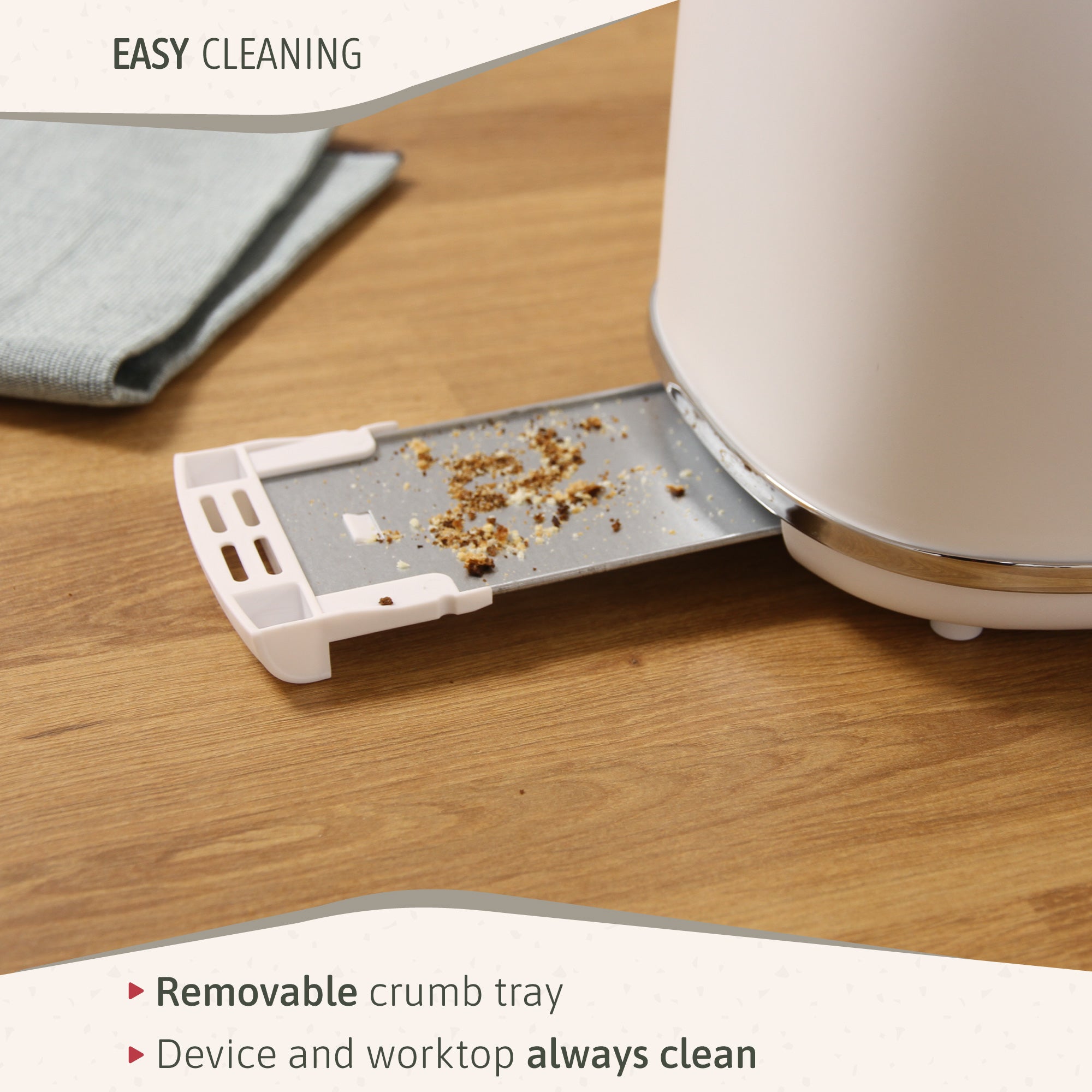 Sus ranuras anchas son perfectas para tostar rebanadas de pan de hasta 3 cm de grosor. La tecnología de centrado automático asegura una distribución uniforme del calor. Además dispone de bandeja recogemigas extraíble para mantener el tostador y la encimera siempre limpios.