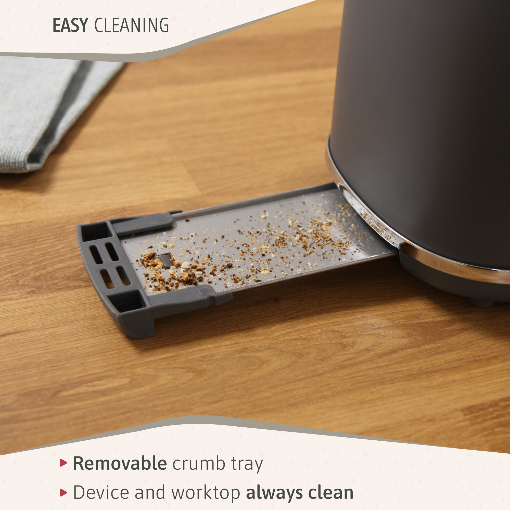 Sus ranuras anchas son perfectas para tostar rebanadas de pan de hasta 3 cm de grosor. La tecnología de centrado automático asegura una distribución uniforme del calor. Además dispone de bandeja recogemigas extraíble para mantener el tostador y la encimera siempre limpios.