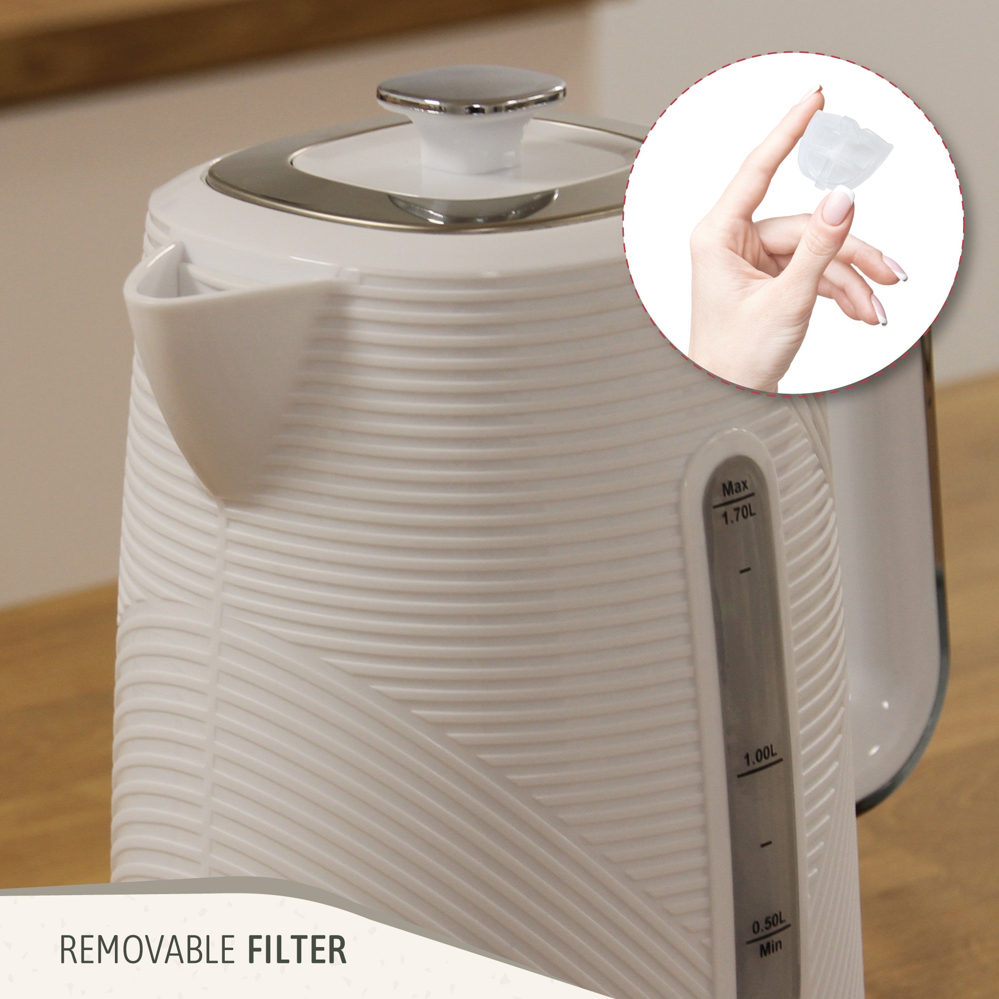 El hervidor eléctrico dispone de una ventana con escala para que puedas ver en todo momento la cantidad de agua que hay en la jarra.La cantidad mínima para hervir es de 0,5 litros y la cantidad máxima de 1,7 litros. Su interruptor permanece iluminado mientras el hervidor está en funcionamiento.El diseño sencillo y a la vez elegante del set de desayuno hará que quieras lucirlo en tu cocina como un elemento decorativo mas.