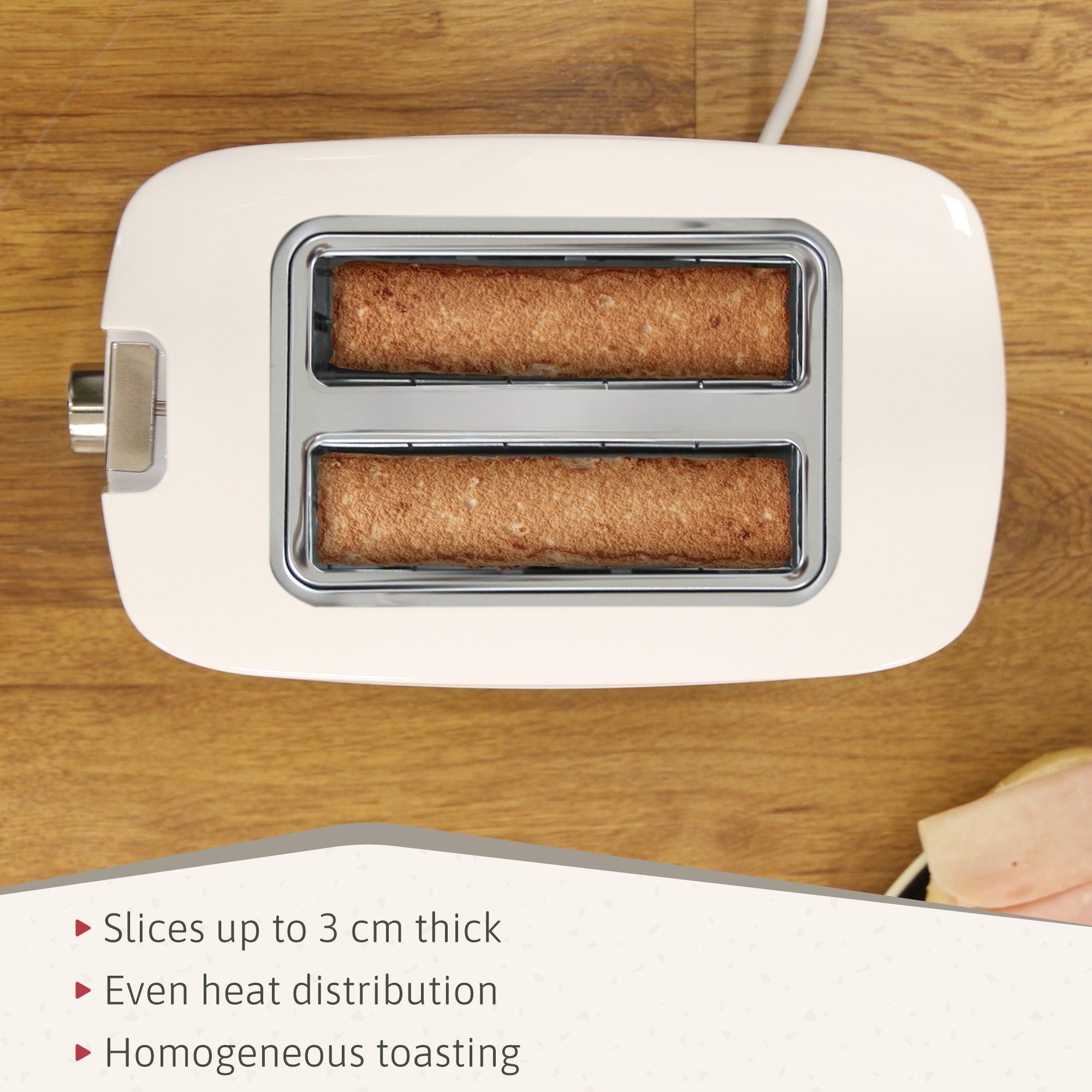 Sus ranuras anchas son perfectas para tostar rebanadas de pan de hasta 3 cm de grosor. La tecnología de centrado automático asegura una distribución uniforme del calor. Además dispone de bandeja recogemigas extraíble para mantener el tostador y la encimera siempre limpios.
